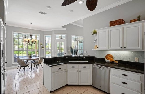 welcome to seaside serenity, where island time is the only time that matters Nestled on a quiet cul-de-sac, this spacious, professionally designed retreat is perfect for slowing down and soaking up the sun. Just two blocks from the soft white sand, you can stroll to the beach or take the 2 golf carts provided for easy hauling. Lounge by the private heated pool in the large backyard, complete with seating, sunning areas, a grill, and outdoor fans.