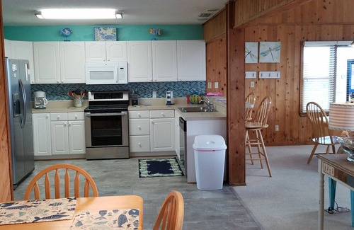 the top level of the home greets you with an open kitchen and a great room, with natural sunlight as there are five sun windows in the high vaulted ceiling All new furniture and flooring, a small library with books, puzzles, family games, a 42" flatscreen smart TV, and wireless internet are provided for your entertainment. There is a breakfast bar with a large dinning room table to enjoy meals with family and friends. Every seat on the top level offers amazing views through the large glass windows and sliding glass doors to view the ocean. A large new sun deck is located off the great room, looking towards the ocean, with plenty of Adirondack chairs for relaxing. A screened-in porch is connected to the kitchen on the backside of the house, perfect for watching the sunset.