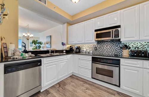 prepare a culinary masterpiece in the updated gourmet kitchen, boasting new stainless-steel appliances including a side-by-side fridge with in-door ice and filtered water dispenser, granite counter tops, beautiful custom tiled backsplash, and all the small appliances, utensils, dishware and cookware needed to whip up a scrumptious meal and impress your family and friends! book your dream vacation today!