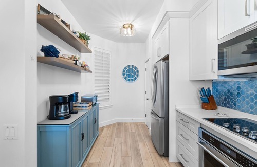 the gourmet kitchen is a chef's dream, featuring new cabinets, all new appliances, quartz countertops, all dishware, cookware, and utensils needed to prepare a culinary masterpiece The glass dining table just off the kitchen offers comfortable dining for six. The kitchen peninsula has been enlarged to accommodate dining for two. A pull-down queen size Murphy Bed with a 10” thick mattress has been installed near the dining area. It sleeps two guests. The bed can be lowered without moving any furniture. The living area includes a large stylish L-shaped sectional sofa and three recliners, perfect to gather with family and friends while enjoying the 65” Smart (HDTV) Flat-Screen Television or movies with the 4K Ultra HD Blu-Ray Player.