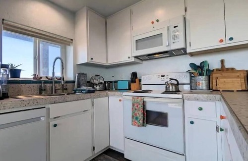 a fully outfitted kitchen - electric range, refrigerator, microwave, crock pot, blender, bread maker and all the pots pans dishes and flatware you'll need