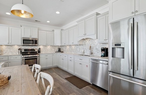 take the exterior staircase to the main floor to find an open living, dining, and kitchen space adorned in breezy, coastal-chic décor The true star of the space is the nearly 180-degree vista of the Gulf’s resplendent waters showcased by numerous oversized windows. Curl up on the slip-covered sofa and loveseat to take in the view while gathered with loved ones. For entertainment, there’s a 65” Smart TV to the side. The kitchen is equipped with Bosch and LG appliances, plus 2 coffeemakers, and a 6-person dining table. If eating alfresco is preferred, the Gulf-front balcony hosts high-top tables and leads to a table for 6 on the beach walkover. Enjoy a peaceful night’s rest at bedtime in the guest bedroom with a king bed, Roku TV, and private balcony.