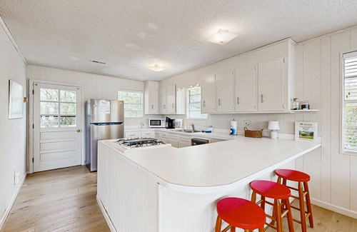 this roomy beach home is the perfect spot for your next destination getaway With an open deck for soaking up sun and star gazing, you can indulge in witnessing all of the nature surrounding you while sipping your morning coffee or evening cocktails. For rainy or too-hot days, the covered patio under the house provides the perfect location to relax and gather for respite. Inside, the home offers plenty of space and seating for various activities, and the fully-equipped kitchen has everything you need for whipping up all your favorite meals and snacks. For a little privacy, or winding down at the end of a busy day, sink into comfortable beds and enjoy the TV and ceiling fans provided in the bedrooms. Grill out on the deck or swing lazily on the tree swing; there's no shortage of fun. Only blocks away from the beach, your days will be fun-filled in the surf and sand. There are also so many other things to do, from touring the environmental center with interactive displays and live-animal exhibits to hiking or walking and shelling (there are even wheelchair-accessible trails), to fishing along the pier, or launching a boat into the Big Bat Creek. Of course, take advantage of all the local shops, boutiques, and eateries.