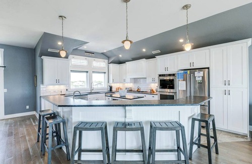 top-level: living room with smart tv, fireplace (gas), additional seating area with smart tv, wet bar (mini-fridge and sink), and deck access; dining room with table (seats 10) and deck access; kitchen with bar (seats 6), blender, coffee maker (drip), coffee maker (keurig), 2 dishwashers, microwave, oven/stove, refrigerator, toaster, pots, pans, dishes, and cooking essentials; king master bedroom with smart tv and attached full bathroom; hall half bathroom