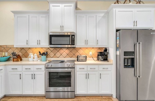 on the second floor, enjoy soothing tones with a spacious, open plan Lots of comfortable seating and tile floors, and large glass doors provide loads of natural light and stunning views of the Bay from the screened porch. The large, screened-in, covered deck is perfect for relaxing and offers comfortable seating for taking in sunsets and coastal breezes. Back inside, the fabulous dining table with upholstered chairs seats 10, and kitchen counters seat 6, providing lots of room for your crew at mealtime. A highchair and a children’s dining table are provided for the little ones in your crew. The large kitchen features fabulous appliances including a standalone ice machine as well as a separate beverage cooler for all your extra beach drinks. large corian counters provide lots of meal preparation space, and the chef in your crew will appreciate being able to visit with guests and take in coastal views of the apalachicola bay and gulf while preparing beachside feasts!