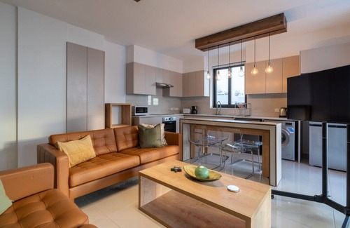 the kitchen is a joyful mix of style and function Modern appliances meet open shelving and soft pendant lights to create a space that inspires—whether you're preparing a family meal, crafting a Greek salad, or brewing a quick espresso. A stove, oven, microwave, dishwasher, washing machine, and all your essentials are thoughtfully included, making each stay feel easy and complete.