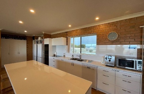 the newly renovated and fully equipped upstairs kitchen, with island bench, has everything guests need to cook up a storm Plenty of fridge and freezer space is available in twin bottom mount fridges. There are 2 full size, high end Electrolux ovens, one also a steam oven, a smaller oven/grill, and a Miele induction cooktop. There is a Weber hooded barbecue and 12 seater outdoor dining setting on the front undercover balcony. There is a dishwasher to help with the clean up afterwards. On the ground level there is a kitchenette with fridge/freezer, sink, microwave, electric jug and toaster.