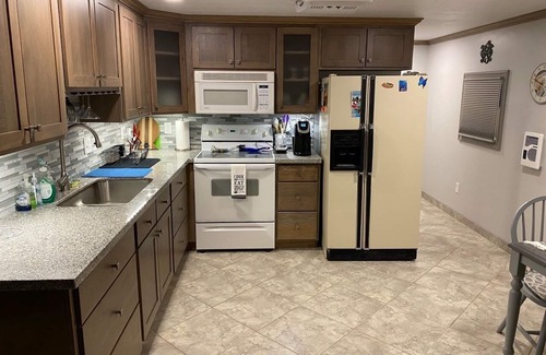 welcome to your cozy retreat! this charming accommodation features a master bedroom with a queen-sized bed, along with a comfortable futon bed in the living room—perfect for accommodating additional guests The fully equipped kitchen offers all the essentials for your culinary needs, including a stove, refrigerator, microwave, plates, glasses, pots, pans, utensils, and flatware. The bathroom boasts a convenient bathtub/shower combination, and towels and linens are provided for your comfort.