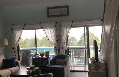 you will fall in love with our home away from home at the beach! our cozy loft condo is located towards the end of the building and on the east end of 30a Located a block from the Walton Dunes access, our unit is tucked away in a quiet building that overlooks a small lake to the east and views of the Gulf to the south. Beachy Basset has a mellow beachy vibe. The upstairs loft area has a queen size bed and a small couch with a fold out that comfortably sleeps one. The downstairs includes the bathroom and kitchen where you can prepare a delicious meal, a quick snack or heating up leftovers. Also on the first floor is the living area with a queen size sleeper sofa and Ikea stackable beds for more sleeping space. Our unit comfortable sleeps 5. And is located on the top floor of the building. An elevator is available for access as well as external stairs.