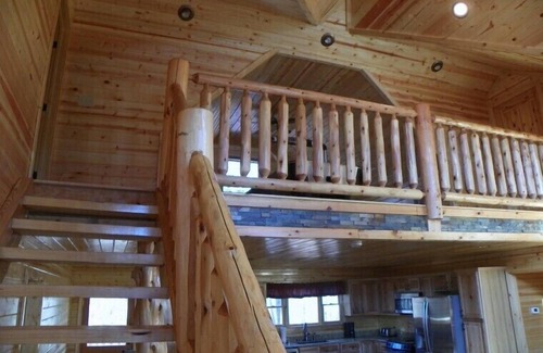 the upper loft area is equipped with two bedrooms with queen size log beds