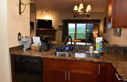 Bear Elegance is a 2 bedroom, 2 bath condo located on the 5th floor in Big Bear Resort, Pigeon Forge that sleeps 6. The property has an indoor pool, hot tub, fitness room and game room within the 1st floor of the building, accessible by elevator. There is also an outdoor pool and hot tub within walking distance. Each bedroom has a king size bed with TV and a queen sleeper sofa in the living room. Electric fireplace in the living room and main bedroom. Balcony overlooking Bluff Mountain and Pine Mountain with patio seating and a rocking chair. Books and games for entertainment. Toys in the guest closet. A coffee pot and Keurig along with pots, pans and plenty of utensils ready for you to make yourself at home. A full size washer and dryer located in the unit for your convenience.