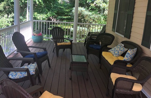 the house is located on a quiet street, has a large front porch, private back yard and 2 large decks for casual dining and relaxing