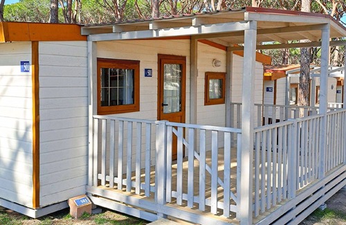 the baia lux vacation property is a 3-room mobile home spanning 31 square meters It features a practical living and dining area with a dining table and satellite TV. There is one double bedroom with a 140 cm bed and another room with two 70 cm beds. The kitchenette is equipped with four gas rings.