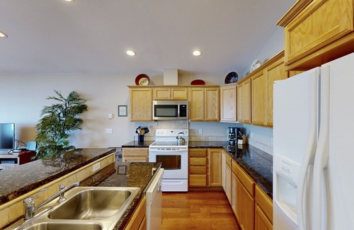 you'll never miss out on the action in the open kitchen, which offers granite counter space, modern appliances, and even a dishwasher for your convenience The bar counter provides seating for two and the dining area has space for four.