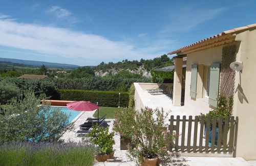 Gite in about a superb house with typical stone terrace and unobstructed view over Roussillon and its ochres, with big pool (12 x 6 m). 3 large tastefully decorated bedrooms, 1 large brand new bathroom with walk-in shower, separate toilets, large walk-in closet, toddlers gear.