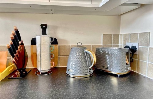 the smart front entrance leads to the lift or a grand staircase to the 4th floor Your apartment is at the front with views of the sea in one direction and Oliver's Mount in the other. A small entrance lobby leads to a spacious living room furnished to a high standard, with large bay window at one end and a fully equipped kitchen at the other. There's a very comfortable SNUG 3 seater double sofa bed with all bedding provided, an easy chair, dining table and chairs, smart TV, Amazon smart speaker, high quality lighting and fittings. The living room curtains and Roman blind in the bedroom are full black out. The kitchen has a hob, oven, microwave, toaster, kettle, washing machine, fridge, Dolce Gusto coffee machine and pods, Denby tableware, instant coffee, tea and milk are also provided.