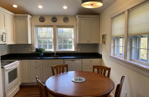 Proud Member of Nantucket Chamber of Commerce! Our property has two large homes on it, the cottage is at the rear of the property.Great house for children! The cottage has a covered front porch that enters into a large livingroom with flatscreen high def TV with streaming,wireless EXTREME PRO internet and a large selection of books, games and puzzles. The bright new living room has vaulted ceilings, hardwood floors and opens to the kitchen with soapstone counters and all the comforts of home. Central air provides comfort in summer and heat in winter. A powder room on the first floor makes family rentals very comfortable. Our primary bedroom is at the end of the hall on the first floor and features a queen size bed with all new linens and a flat screen TV. The attached bath has a shower and plenty of storage for all of your personal needs. Sheets are professionally laundered and sanitized.The staircase in the livingroom guides you to the second floor hall which has all new wide plank flooring. The laundry is on the second floor making family rentals a breeze! Vaulted ceilings and three bedrooms and a large updated and decorated bathroom compliment the second floor. The first bedroom has two twin beds with all new linens. The second bedroom has a queen size bed with all new linens and a flat screen TV. The third bedroom has two twins with all new Linens and plenty of storage. The second floor bath is large and bright with all new towels. Around the back of the cottage is a huge private yard with a family size deck and furnishings. A new outside shower added 2023! Enjoy a meal or family get together in seclusion! Mature plantings grace the property and add to the privacy. One off street parking space in large driveway. Once you are settled in our Nantucket Cottage take a stroll down Historic Orange Street to Main Street and enjoy all that town has to offer. walk to the harbor and take a sail on the endeavor or dine in one of the fantastic restaurants, all a short walk from the cottage! the wave bus runs all over the island and stops in front of our property, take a day to explore, bring a map and a camera with you! children welcome!