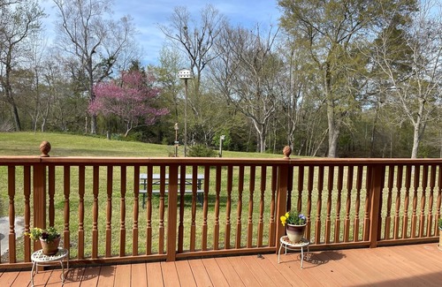 Fawn Meadow Lodge is situated well off of the road on 4 private acres where you can enjoy beautiful views of the Contentnea Creek and local wildlife from the large lower deck or the cozy upper screened porch. Adjacent to a wildlife rehabilitation refuge for fawns, you are very likely to see deer as well as squirrels, rabbits, otters, eagles, etc. The lower deck is furnished for relaxation and includes a porch swing, charcoal grill and a propane gas fire pit perfect for making s'mores. Launch your small creek boat or kayak at the gravel launch area or nearby at the small public launch. Enjoy great fishing, wildlife viewing, walking or shooting hoops on the concrete pad. The lodge is convenient to world-class BBQ including the Skylight Inn and Bum's BBQ or multiple other dine in or fast food restaurants serving a wide variety of foods. Conveniently located between Greenville and Kinston, this is perfect for attending local ECU football games (30 min.), graduations, or for access to ECU Health Medical Center (25 min.) and UNC Lenoir Hospital (17 min.) . Two stop signs away from the new Greenville bypass, local trips to and from Greenville are quick and easy. This beautiful log cabin has vaulted ceilings and a balcony common area with lots of exposed beams for that warm, cozy feeling that only a log cabin has. The kitchen is well furnished with all appliances and includes a dishwasher, microwave, toaster and dual-service coffee maker for coffee by the pot or the cup. Basic condiments and spices are provided. Bring your groceries or shop for them a mere 10 minutes away in Ayden. There is table seating for 10 indoors or have a picnic at the picnic table in the beautiful backyard. Fawn Meadow Lodge sleeps 8 with linens and towels ready for your arrival!.