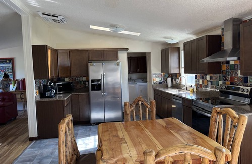 A newly built, completely remodeled modular home on 1/2 an acre, bordering 4 hunting units. This beautifully decorated place has room for everyone, and was furnished with the the needs of our guests in mind! Featuring almost all new appliances, to a completely stocked kitchen, to new, comfy beds, we want you to be comfortable and enjoy staying here. The Master bedroom with king bed & futon has an adjoining master bath with both garden tub & shower. The 2nd bedroom is furnished with a full bed, and bedroom 3 has twin beds. In addition, there is a living room, family room, AND dining room, with great couches & beds thrown in for your comfort. Flatscreen TV's are throughout the house, and while we are located rurally, we still have the comforts of home like wireless internet, satellite TV & Verizon cell service provided for our guests. 1 block from millions of acres of National Forest, and across the street from our private fishing ponds, you won't be without something to do! Come stay with us, relax, and enjoy…....