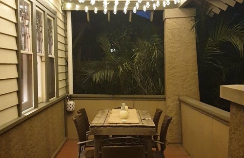 hidden behind a tall hedge is a large heritage home with double door wide entrance hall, high ceilings, 4 bedrooms with 2 living areas with open fire places(not in use, ornamental only), dining, country kitchen, 2 bathrooms, 5th small bedroom/office(original maids room) and sleeps up to 10 people