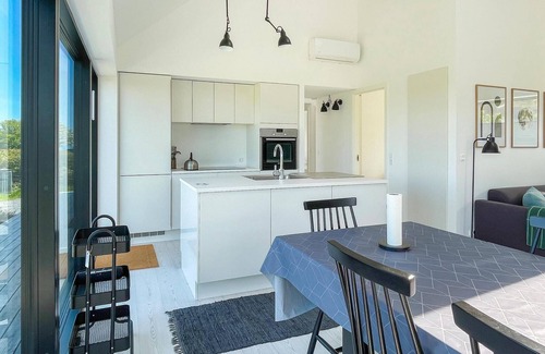 the house is pleasantly furnished in a modern style At the center of domestic life is the large and bright living and dining room with a beautiful, well-equipped kitchen. Large windows let in plenty of light and allow a view of the water. Here you can cozy up in comfortable seating, watch TV (Chromecast available) and enjoy the warmth and cozy atmosphere of the fireplace on cooler days. There is comfortable underfloor heating in the bathrooms. For the household you will find a washing machine and dryer.