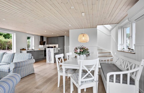 your modern holiday home on bornholm invites you to enjoy a relaxing stay in bright, airy rooms The furnishings are friendly, Nordic and of high quality. Relax in the cosy living area with wood-burning stove and large windows that let in plenty of natural light. Cook in the open-plan, practically designed kitchen with modern appliances and enjoy meals together at the dining table with a view outside. Lean back in one of the two recliners on the upper floor and watch the sky over the coast.