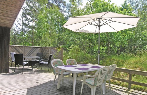 your holiday home in snogebæk is bright and practically furnished, with many thoughtful details, and is ideal for two families The open-plan kitchen leads into the cosy, combined living and dining room with wood-burning stove and alcove. On the large wooden terrace of the house you will find a sheltered corner that is ideal for relaxing.