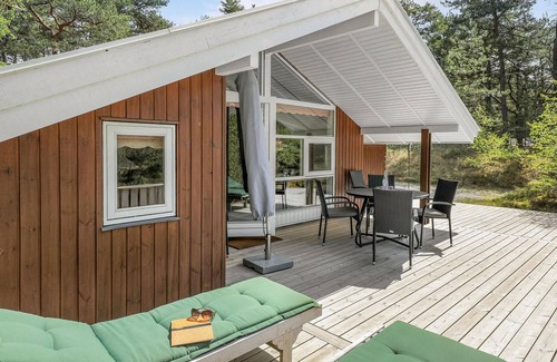 Inviting and well-maintained cottage with modern, open kitchen and located not far from the beautiful sandy beach, a beautiful nature and Dueodde golf course. Everywhere the cottage is cozy, the light wood paneling on the walls the sloping ceilings give the interior a nice atmosphere. In the evenings you can retire to comfortable sofas and reclining chairs. There is an alcove for a midday nap. There is a barbecue on the terrace. In the well-equipped house you can enjoy the internet for free. It is heated with a heat pump and a wood-burning stove to make it really cozy. In the neighborhood are large nature plots, good hiking trails and inviting jogging trails. Nice and close you can find the beach. The house is ideal for a vacation in any season.