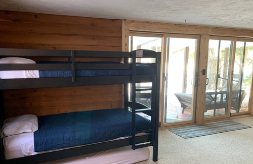 the house was recently updated with new furniture, mattresses, and appliances, so guests can enjoy this pristine natural setting with modern amenities The layout is perfectly designed for large groups. The main and upper levels each offer two bedrooms and one bathroom, plus a lower level with bunks, queen pull-out sofa, and additional bathroom. Both the main and lower level have living rooms outfitted with 60” smartTVs (streaming apps and cable) and cozy wood-burning stoves. The office nook on the upper level includes a desk with pristine views of the lake. The home has central heat, zone cooling in the main living space, and ceiling fans in the bedrooms. Wi-Fi and cell service are strong throughout the property.