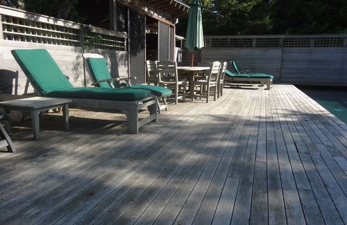 there is a gorgeous swimming pool and deck set among trees next to the house The pool house has a large gas-fired grill and further table seating, and there is an outdoor shower. The property runs down to Chilmark Pond and there are a kayak and sailboat available to use on the pond or reach the fabulous sought-after private Hancock Beach on South Beach. The property also comes with an exclusive beach key so you can drive down to the beach by road.