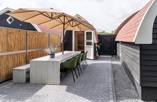 this modern holiday home is located in a small-scale holiday park, in the middle of the forest Due to the shape of the partly thatched roof, this accommodation has a special appearance, both outside and inside. The holiday home is suitable for up to four adults and two children and features three bedrooms. One of the bedrooms has a bunk bed (for children). The living room with open plan kitchen features a comfortable sitting area and a spacious dining table. Perfect to spend some quality time together. On nice days, you can open the French doors and also enjoy the terrace with garden furniture. This accommodation is equipped with a lovely sauna. At this holiday park, you can also book other accommodations for various groups and in various locations.