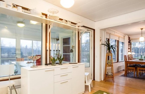 Updated home on Lake Sävsjön, 1 hour north of Örebro. 2 patios, a nice dock to enjoy your morning cup of coffee, spacious kitchen, sunroom, sauna, and privacy. A slice of quiet paradise to reset your soul..