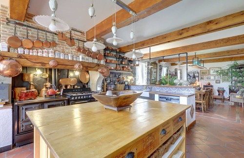 • a vast 60 m² living area with an open kitchen fully equipped: a 7-burner cooking range, wood-fired oven, two classic ovens, and a culinary library of 200 books