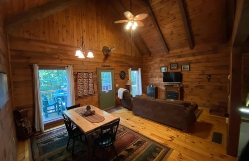 Our real log home has been recently renovated and completely redecorated.The cabin sleeps 4 but is really intended for a romantic couple's retreat. It has a loft with a queen log bed and furniture. The living room has a gas fireplace for snuggling on cold evenings. For extra guests there is a pull out sofa. The kitchen is fully equipped and the dining room is furnished with a log table. On the deck you will find a gas grill, outdoor table and chairs, and a 4-person hot tub, great for star gazing. Central AC/Heat. Ceiling fan. Flat screen TV w/DVD and CD player. No local or cable tv provided. Hardwood floors throughout. Bed & bath linens provided. Hot tub towels provided. No Pets. No Phone. No internet. Limited cell service.