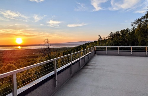 large windows and glass doors to two large decks, one on each level and a large roof deck up top that gives you amazing views of denali and the alaska range on clear days and sleeping lady as well as the knick arm inlet Billion dollar water and mountain views from every window.