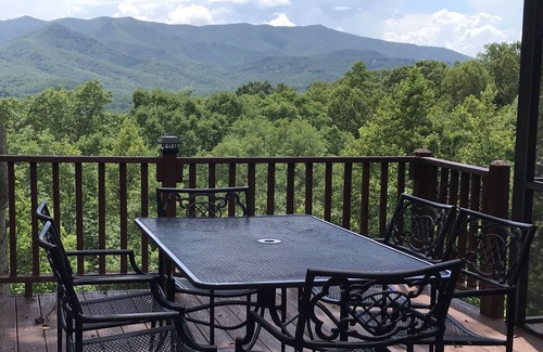 Brown Bear Hideaway is very convenient to downtown, only 2 miles from the middle of Hiawassee, Georgia. The drive is very easy to the home and is paved road. The home sits on a private lot with many trees. A flat driveway and only a four steps to the main level of the home where you will find a living room, kitchen, 2 bedrooms, a queen, 2 twins and a full bathroom between. The sofa makes into a sleeper. A wood burning fireplace for cool nights. Enjoy an oversized large screen porch with a year round fantastic 30+ mountain peak view of the Appalachian Mountains and the National Forest. See the tallest point in Ga, Brasstown Bald from the deck. An outside dining table that seats 6 for meals outside with a view. The lower level of the home has another bedroom, a king, living room with seating and a 50" TV, foosball table, full bathroom and outdoor screened patio area with corn hole game, 2 oversized rockers and a picnic table. A door leads to a lower yard with a fire pit. The home is furnished with a full kitchen, linens and has log beds and a mountain theme decor. Charcoal grill available next to a firebowl near the parking area and plenty of seating. Covered parking available. We know you will love the location, privacy and peaceful surroundings of Brown Bear Hideaway Just 25 minutes to Helen Ga and 7 minutes to downtown Hiawassee, Georgia..