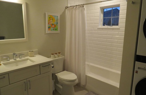 there are two bedrooms; the master bedroom with queen bed, ensuite bathroom, and walk-in closet, and the guest bedroom with two twin beds pushed together to use as a king bed There is also a spacious second bathroom with shower and laundry closet with stackable washer and dryer.
