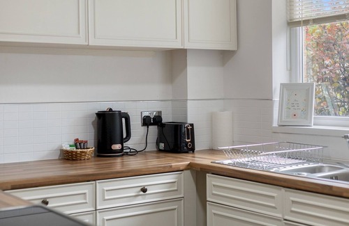 leading through from the living area is a fully equipped kitchen, thoughtfully designed to meet all your self-catering needs It includes an oven, hob, fridge/freezer, microwave, kettle, and toaster, along with all the essential cookware, utensils, and crockery. Whether you're preparing a full meal or a quick snack, you'll find everything you need right at your fingertips. From the kitchen, you’ll also have direct access to the enclosed back garden — a peaceful, private outdoor space ideal for morning coffee or simply soaking up some sunshine.