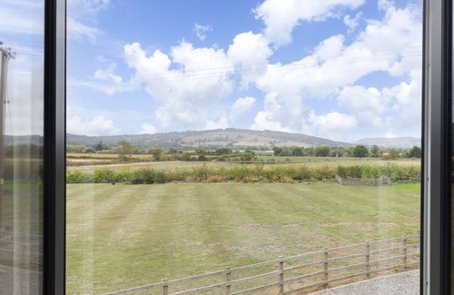 upstairs, the space opens into a bright and airy open-plan living, kitchen, and bedroom area The fully equipped kitchen has everything you need to cook and dine in style on it's breakfast bar, while the king-size bed invites restful nights. A smart tv lets you access your own streaming accounts, and the Juliette balcony opens wide to reveal breathtaking countryside views—a perfect spot to enjoy your morning coffee or unwind at sunset.
