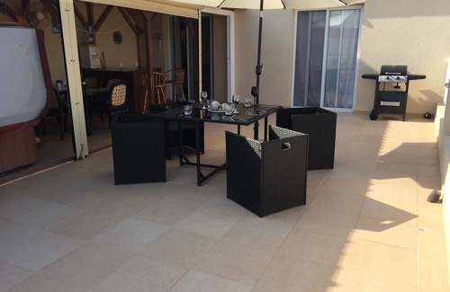 the balcony on this beautiful penthouse apartment is by far the largest out of the properties on the saint georges complex It has a gazebo covering over a small bar & table seating area which seats up to six persons. At the back of the gazebo is a large four seater *hot tub* which when used has jets that massage areas of the body. (Additional cost must request on booking).