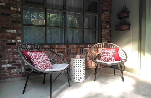 This peaceful home is 4 miles from Tinker St, offers two acres of serene woodlands, a fire pit, pool & porch for bird watching.