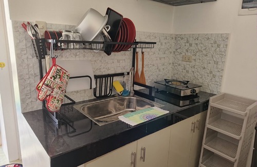 the apt is equipped with a small terrace (shaded in the evening), a split unit 1-hp ac, a cooling fan, free wifi, all new appliances: a microwave, hot water kettle, rice cooker, full cooking utensils, pots & pans, dishware, flatware, cups, glasses, tea and coffee There is also a nearby laundry that our guests can avail. Note: This apt. does have a pullout bed for children.