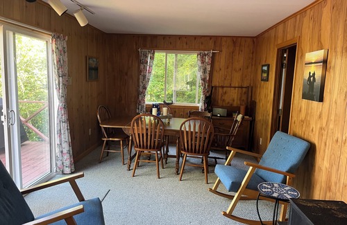 this well-appointed cottage sleeps 6-8 people and has 4 bedrooms It has a spacious kitchen with an eat at counter overlooking the lake, dining room that seats 8 and a full bathroom with tub. The main floor has 2 bedrooms with a full bed and queen bed. Downstairs provides a large living room for relaxing on a rainy day and watching cable TV or streaming your favorite movies. Downstairs there are 2 bedrooms, a queen bed and a bunk bed.