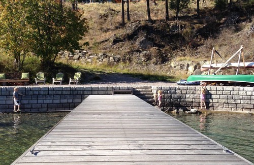 Beautiful Timber Frame / Strawbale home on east shore of Finley Point on Flathead Lake, located on Skidoo Bay. 120' of lake frontage with private dock. 3 Bed, 2 Bath, outdoor shower, huge sleeping Loft, Great Room. The main house sleeps up to 8 people. 2 Portable crib available. Two bedrooms have a queen each, one with a pullout couch. One bedroom has a twin, full bunk bed. Loft has additional area for sleeping with a futon couch/bed. There is an additional sleeping loft above the garage that can sleep up to 8 additional guests. The downstairs of the garage has a full bathroom and open area with a ping pong table. The timber frame was constructed from fir and larch that was harvested to build an apple orchard on an adjacent lot. The straw bales were bought from a local farm and the home constructed during the course of a year with help from a stawbale workshop. Curious about timber frame or strawbale homes, come vacation in one, and enjoy the lake and all the recreation that western Montana has to offer.