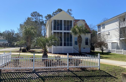 Gorgeous, fully renovated home away from home offers a breathtaking view of the intracoastal waterway from the privacy of two private screened in front porches. One block to beach access road and only minutes from restaurants, grocery stores, beach stores, bars, ice cream and candy shops and fun places for the whole family.