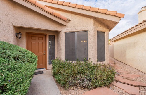 Located in a Tempe a few miles south of Phoenix, this quiet, two bedroom Tuscan style ranch is a private home on a dead end street with a green belt walking path steps from your door. The home has been recently remodeled including beautiful new tile floors, carpeting, furnishings and refinished kitchen cabinetry. The house has its own private backyard patio with a barbecue and your own orange tree. A community swimming pool and spa are available a short walk away. (Pool is unheated; spa is heated during holidays). The location is near world-class golf courses and most of the Spring training Cactus League sites are close by (5 sites are within 10-20 miles and remaining 5 within 30 to 45 miles). Wifi, smart TV with cable all included. There is a fully stocked kitchen for the cooking enthusiast or plenty of excellent restaurants nearby. ASU is a 10-15 minute drive down the street. Bedrooms sleep 4 comfortably, and you can sleep an additional two people on air-mattresses in the den which is off of the living room (with doors for privacy). The house is located in Tempe, 12 miles south of Phoenix Sky Harbor airport. Tempe Short Term Rental License #STR-000436.