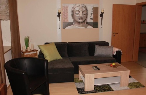 the apartment offers a kitchen with comfortable seating for up to four people The kitchenette is equipped with a fridge and freezer, oven with hob and dishwasher. Also available to guests the existing microwave, coffee maker (filter and pad machine) and other equipment available. The living room with a large flat screen TV and DVD player invites you to cozy hours. The pull-out sofa bed can accommodate additional guests. In the bedroom, guests will find a large wardrobe and two single beds, which can be put together. The linen will be provided at no extra charge. The bathroom has a toilet, vanity, shower and washing machine. Similarly, a hair dryer and towels are provided on site..