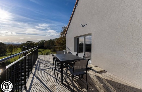 An idyllic retreat in the heart of nature, offering the perfect blend of modernity and picturesque charm. This brand new gîte invites you to an unforgettable stay experience, with a large high terrace offering a spectacular view of the Puys chain. Whether at sunrise or nightfall, this view will create memories that will forever be etched in your mind. The interior of the cottage is carefully decorated, combining elegance and comfort. The large bay windows flood the space with light in the living room. Ideal for family or friends, everyone will have their own space (up to 6 people with additional sleeping in the convertible sofa). The cottage is composed on the 1st floor (accessible by an external staircase): - a living room open to the kitchen - a bedroom with a 160 bed - a bedroom with two 90cm beds - a bathroom/WC Air conditioning for summer in the accommodation.
