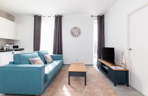 -bright living-dining room with capacity for 6 diners equipped with a double sofa bed of 160x190cm, round dining table, hd tv and access to an elongated balcony