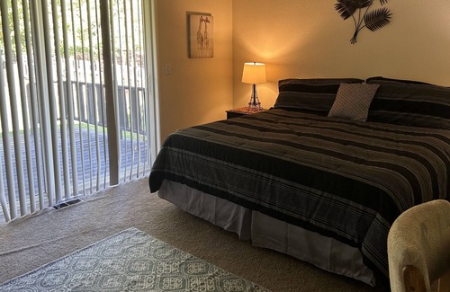 the king master has its own exit onto the spacious back deck and yard The second bedroom has a queen bed and two twin beds compliments the third bedroom. The couch in the TV room rolls out to accommodate two more people if needed. There are 2 full baths.
